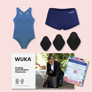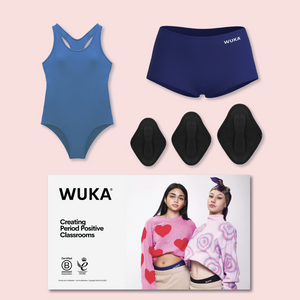 Digital Lesson Pack for teachers to use in PSHE lessons / WUKA Period Pants x1 / WUKA Reusable Period Pads x3 / WUKA Teen Swimsuit x1 / Promo Flyers with an educational offer of £4.99 for students' first pair.